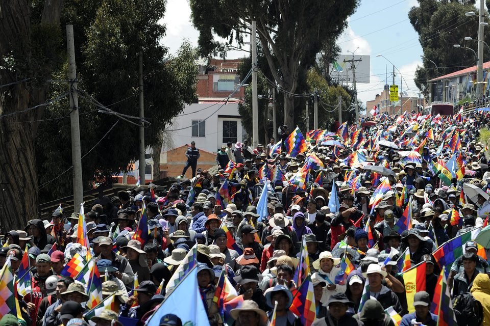 ​Miles de campesinos y obreros afines al exmandatario llegaron a La Paz para protestar por el aumento de la canasta familiar y pedir la renuncia del presidente. La policía reprimió con gases.Miles de campesinos y obreros afines al exmandatario llegaron a La Paz para protestar por el aumento de la canasta familiar y pedir la renuncia del presidente. La policía reprimió con gases.