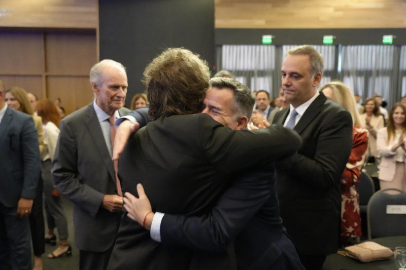 Adorni siendo apapachado por Milei en la Bolsa de Comercio de Córdoba.