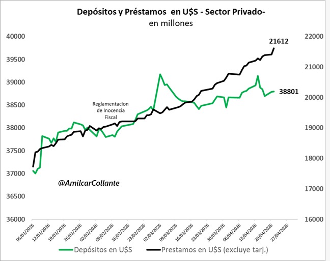 Ahí entra la lectura de Amílcar Collante. Este economista advirtió que la reglamentación de la “inocencia fiscal” no tuvo impacto relevante en los depósitos en dólares, la gran apuesta de Milei y Caputo. Los números que muestra son claros: los depósitos rondan los USD 38.800 millones y no despegan, mientras los préstamos en dólares superan los USD 21.600 millones y siguen creciendo.